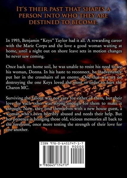 It's their past that shapes a person into who they are destined to become. In 1993, Benjamin "Keys" Taylor had it all. A rewarding career with the Marie Corps and the love a good woman waiting at home, until a night out on shore leave sets in motion changes he never saw coming. Once back on home soil, he was unable to resist his need to see his woman, Donna. In his haste to reconnect, he inadvertently put her in the crosshairs of an enemy. One that was set on destroying the one Keys loved the most in order to hurt the Charon MC. Surviving the fallout was not easy for either of them, but their love for each other was strong enough for them to make it through. Now, they find themselves with a new house guest, a woman who's been horribly abused and needs their help. But her presence is bringing those old, vicious memories all back to the forefront, once more testing the strength of their love for one another.