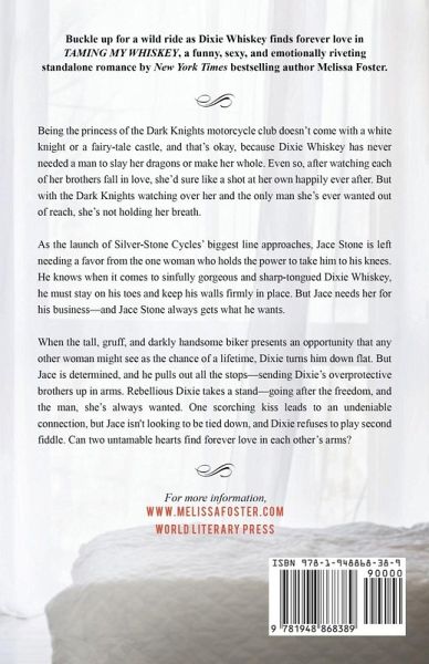 Buckle up for a wild ride as Dixie Whiskey finds forever love in TAMING MY WHISKEY, a funny, sexy, and emotionally riveting standalone romance by New York Times bestselling author Melissa Foster. The perfect love story for those who enjoy fiercely loyal and insanely sexy alpha heroes, smart, sassy heroines, strong family bonds, bikers, babies, and more! In USA Today Bestseller TAMING MY WHISKEY... Being the princess of the Dark Knights motorcycle club doesn't come with a white knight or a fairy-tale castle, and that's okay, because Dixie Whiskey has never needed a man to slay her dragons or make her whole. Even so, after watching each of her brothers fall in love, she'd sure like a shot at her own happily ever after. But with the Dark Knights watching over her and the only man she's ever wanted out of reach, she's not holding her breath. As the launch of Silver-Stone Cycles' biggest line approaches, Jace Stone is left needing a favor from the one woman who holds the power to take him to his knees. He knows when it comes to sinfully gorgeous and sharp-tongued Dixie Whiskey, he must stay on his toes and keep his walls firmly in place. But Jace needs her for his business-and Jace Stone always gets what he wants. When the tall, gruff, and darkly handsome biker presents an opportunity that any other woman might see as the chance of a lifetime, Dixie turns him down flat. But Jace is determined, and he pulls out all the stops-sending Dixie's overprotective brothers up in arms. Rebellious Dixie takes a stand-going after the freedom, and the man, she's always wanted. One scorching kiss leads to an undeniable connection, but Jace isn't looking to be tied down, and Dixie refuses to play second fiddle. Can two untamable hearts find forever love in each other's arms? For more hot Whiskey love, check out Melissa's other Whiskey novels. Tru Blue, Truly, Madly, Whiskey, Driving Whiskey Wild, Wicked Whiskey Love, Mad about Moon and don't miss River of Love, the first story in which the Whiskeys were introduced! The Whiskeys are perfect beach reads with depth of story, strong family ties, and a wealth of emotions. Small town love stories with happily ever afters guaranteed.