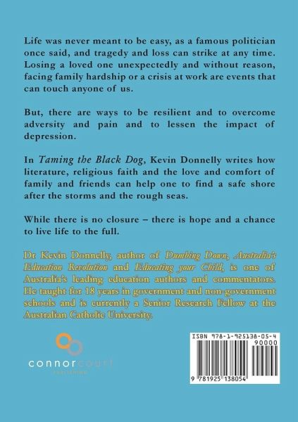 Life was never meant to be easy, as a famous politician once said, and tragedy and loss can strike at any time. Losing a loved one unexpectedly and without reason, facing family hardship or a crisis at work are events that can touch anyone of us. But, there are ways to be resilient and to overcome adversity and pain and to lesson the impact of depression. In Taming the Black Dog, Kevin Donnelly writes how literature, religious faith and the love and comfort of family and friends can help one to find a safe shore after the storms and the rough seas. While there is no closure - there is hope and a chance to live life to the full. Dr Kevin Donnelly, author of Dumbing Down, Australia's Education Revolution and Educating your Child, is one of Australia's leading education authors and commentators. He taught for 18 years in government and non-government schools and is currently a Senior Research Fellow at the Australian Catholic University.