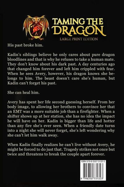 His past broke him. Kadin's siblings believe he only cares about pure dragon bloodlines and that is why he refuses to take a human mate. They don't know about his dark past. A day centuries ago that changed him forever and left him crippled with fear. When he sees Avery, however, his dragon knows she belongs to him. The beast doesn't care she's human, but Kadin can't forget his past. She can heal him. Avery has spent her life second guessing herself. From her body image, to allowing her brothers to convince her that an EMT was a more suitable job than a firefighter. When a shifter shows up at her station, she has no idea the impact he will have on her. Kadin is bigger than life and hotter than any fire she's ever seen. When a friendly date turns into a night she will never forget, she's left wondering why she can't let him walk away. When Kadin finally realizes he can't live without Avery, he might be forced to do just that. Tragedy strikes not once but twice and threatens to break the couple apart forever. This is a large print version, created specifically for low-sight readers.
