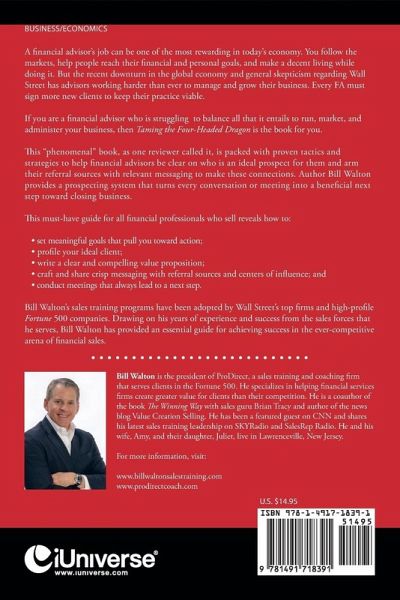 A financial advisor's job can be one of the most rewarding in today's economy. You follow the markets, help people reach their financial and personal goals, and make a decent living while doing it. But the recent downturn in the global economy and general skepticism regarding Wall Street has advisors working harder than ever to manage and grow their business. Every FA must sign more new clients to keep their practice viable. If you are a financial advisor who is struggling to balance all that it entails to run, market, and administer your business, then Taming the Four-Headed Dragon is the book for you. This "phenomenal" book, as one reviewer called it, is packed with proven tactics and strategies to help financial advisors be clear on who is an ideal prospect for them and arm their referral sources with relevant messaging to make these connections. Author Bill Walton provides a prospecting system that turns every conversation or meeting into a beneficial next step toward closing business. This must-have guide for all financial professionals who sell reveals how to: ¿ set meaningful goals that pull you toward action; ¿ profile your ideal client; ¿ write a clear and compelling value proposition; ¿ craft and share crisp messaging with referral sources and centers of influence; and ¿ conduct meetings that always lead to a next step. Bill Walton's sales training programs have been adopted by Wall Street's top firms and high-profile Fortune 500 companies. Drawing on his years of experience and success from the sales forces that he serves, Bill Walton has provided an essential guide for achieving success in the ever-competitive arena of financial sales.