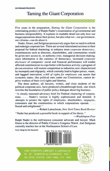 Five years in the preparation, Taming the Giant Corporation is the culminating product of Ralph Nader's examination of governmental and business irresponsibility. It explains in readable detail not only how our megacorporations abuse their power, but also what we-our government, our citizens-can do about it. Nader, Green, and Seligman persuasively argue that we need to rethink and redesign corporate law.