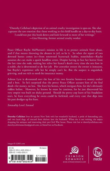 Peace Officer Raylie McPherson's mission in life is to protect animals from abuse, and if that means throwing the abusers in jail, so be it. So when the report of two downed horses comes in - from renowned Starstruck Stables, nonetheless - Raylie assumes she can make a quick headline arrest. Despite having to face her horror from the last time she rode, making her relive her fiancé's death every time she sets foot in a stable, she is determined to do her job. Her coworker swears the owner is innocent, but Raylie's experience tells her he simply can't be. But the suspect is anguished, grieving, and too rich to need the insurance money. Ashton Lyre is devastated over the loss of his two favorite horses-a money maker and a brat. So he's surprised that the pretty Peace Officer accuses him of the foul deed-for money, no less. She fears his horses, which intrigues him, for she's obviously ridden before. However, he knows he must be cautious, for he just discovered his very empire was built on shaky ground. Should the pretty cop learn of his fraudulent start, he fears everything he owns could be forfeited, and every case that dips into his past dredges up his fears. Sensuality Level: Sensual