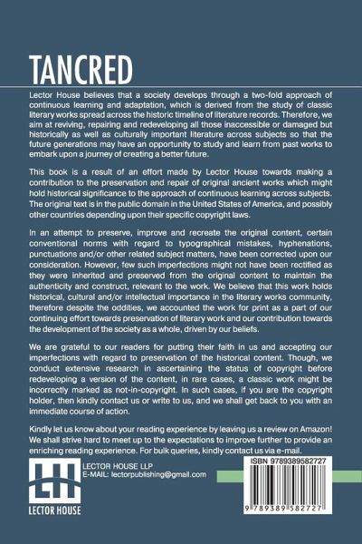 Tancred (Complete): Or The New Crusade (Complete Edition Of Three Volumes) This book is a result of an effort made by us towards making a contribution to the preservation and repair of original classic literature. In an attempt to preserve, improve and recreate the original content, we have worked towards: 1. Type-setting & Reformatting: The complete work has been re-designed via professional layout, formatting and type-setting tools to re-create the same edition with rich typography, graphics, high quality images, and table elements, giving our readers the feel of holding a 'fresh and newly' reprinted and/or revised edition, as opposed to other scanned & printed (Optical Character Recognition - OCR) reproductions. 2. Correction of imperfections: As the work was re-created from the scratch, therefore, it was vetted to rectify certain conventional norms with regard to typographical mistakes, hyphenations, punctuations, blurred images, missing content/pages, and/or other related subject matters, upon our consideration. Every attempt was made to rectify the imperfections related to omitted constructs in the original edition via other references. However, a few of such imperfections which could not be rectified due to intentional\unintentional omission of content in the original edition, were inherited and preserved from the original work to maintain the authenticity and construct, relevant to the work. We believe that this work holds historical, cultural and/or intellectual importance in the literary works community, therefore despite the oddities, we accounted the work for print as a part of our continuing effort towards preservation of literary work and our contribution towards the development of the society as a whole, driven by our beliefs. We are grateful to our readers for putting their faith in us and accepting our imperfections with regard to preservation of the historical content. HAPPY READING!
