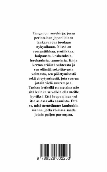 Tangat on runokirja, jossa perinteinen japanilainen tankarunous tuodaan nykyaikaan. Niissä on romantiikkaa, erotiikkaa, kaipausta, kosketuksia, huokauksia, tunnelmia. Kirja kertoo eräästä suhteesta ja sen elämää sekoittavasta voimasta, sen päättymisestä sekä eheytymisestä, jota seuraa jotain vielä suurempaa. Tuskan hetkellä emme aina näe sitä kuinka se voikin olla meille hyväksi. Että luopuminen voi itse asiassa olla saamista. Että se, mitä menetimme kuuluukin mennä, jotta voimme saada jotain paljon parempaa.