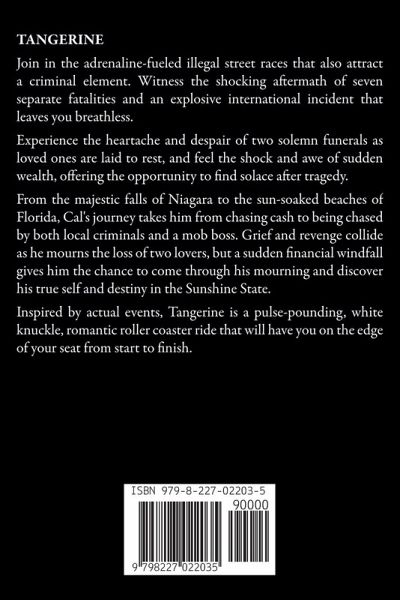 TANGERINE Join in the adrenaline-fueled illegal street races that also attract a criminal element. Witness the shocking aftermath of seven separate fatalities and an explosive international incident that leaves you breathless. Experience the heartache and despair of two solemn funerals as loved ones are laid to rest, and feel the shock and awe of sudden wealth, offering the opportunity to find solace after tragedy. From the majestic falls of Niagara to the sun-soaked beaches of Florida, Cal's journey takes him from chasing cash to being chased by both local criminals and a mob boss. Grief and revenge collide as he mourns the loss of two lovers, but a sudden financial windfall gives him the chance to come through his mourning and discover his true self and destiny in the Sunshine State. Inspired by actual events, Tangerine is a pulse-pounding, white knuckle, romantic roller coaster ride that will have you on the edge of your seat from start to finish.