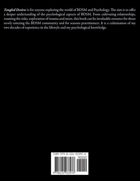 Tangled Desires is for anyone exploring the world of BDSM and Psychology. The aim is to offer a deeper undertanding of the psychological aspects of BDSM. From cultivating relationships, examing the risks, exploration of trauma and more, this book can be invaluable resource for those newly entering the BDSM community and for seasons practitioners. It is a culmination of my two decades of experience in the lifestyle and my psychological knowledge.