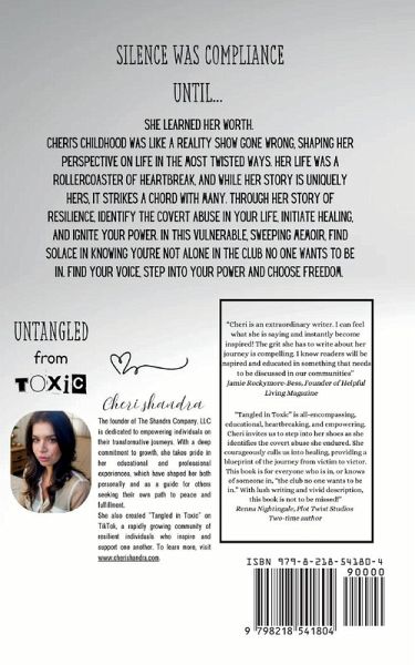 Tangled in Toxic is a deeply intimate memoir that delves into the harrowing yet transformative journey of a girl raised in dysfunction. Through raw, honest storytelling, it traces how covert abuse, neglect, and unresolved trauma shaped her path into adulthood, impacting her identity, choices, and relationships. This unflinching exploration reveals how the scars of childhood manifest in perfectionism, eating disorders, substance abuse, and distorted perceptions of love, painting a vivid picture of how deeply trauma can weave itself into the fabric of our lives. More than a memoir, Tangled in Toxic is a guide for anyone seeking clarity and answers on how to break free from the cycles of pain and dysfunction. It sheds light on the often-hidden struggles of living with the echoes of abuse while offering profound insights into the process of healing and self-reclamation. By vulnerably sharing her journey, the author invites readers to reflect on their own experiences, inspiring them to confront the unspoken burdens they carry and transform them into sources of strength. With thirty-eight deeply moving chapters, Tangled in Toxic is both personal and educational-a testament to the resilience of the human spirit. It recounts a story of survival and serves as a beacon of hope, showing how faith, courage, and self-awareness can lead to a life of freedom and fulfillment. Each page reminds us that no matter how tangled our past may seem, we hold the power to untangle it, reclaim our worth, and create a brighter, more empowered future. For anyone yearning for hope, clarity, and a roadmap to change, Tangled in Toxic is a life-altering read that proves transformation is possible-even in the face of unimaginable pain. It reminds us that while the journey may be challenging, healing is within reach, and with hope and faith as our companions, we can rise above the shadows of our past and step into the light of a new beginning.