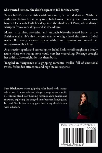 She wanted justice. She didn't expect to fall for the enemy. When Isabel's sister vanishes without a trace, her world shatters. With the authorities failing her at every turn, Isabel vows to take justice into her own hands. Her search leads her deep into the shadows of Paris, where danger whispers from every alley-and so does desire. Manon is ruthless, powerful, and untouchable-the feared leader of the Parisian mafia. He's also the only man who might hold the answers Isabel needs. But every moment spent with him threatens to unravel her mission-and her heart. As attraction sparks and secrets ignite, Isabel finds herself caught in a deadly game where one wrong move could cost her everything. Revenge brought her to him. Love might destroy them both. Tangled in Vengeance is a gripping romantic thriller full of emotional twists, forbidden attraction, and high-stakes suspense.