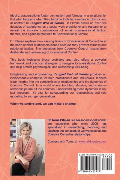 Tangled Web of Words: A Breakthrough Guide to Conversational and Coercive Control in Relationships by Dr Torna Pitman is an essential resource for understanding why and how conversations matter for healthy relationships. This includes the conversations we don't have, should have, or can't have with our partner and those mishandled due to unfair conversational tactics. Drawing on over two decades of experience as a social worker, practitioner, and researcher, Dr Pitman coined the term Conversational Control to explain how this works and provides profound insights into how different levels of unfair conversational tactics lead to relationship stress, dysfunction and abuse. Conversational Control at higher levels gradually grooms the unsuspecting into compliance and is called Coercive Control. This book offers practical strategies and frameworks for practitioners, therapists, counsellors, and individuals to recognise and navigate these dynamics. Tangled Web of Words is enlightening and empowering, providing an indispensable compass for practitioners and individuals. It offers straightforward and profound insights into the complexities of relationships and the dynamics of Coercive Control, ensuring readers are well-informed and confusion is a thing of the past. Visit www.talkingwise.com to access and print resources from the book.