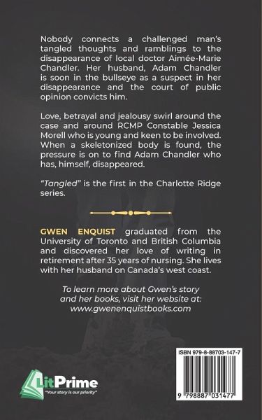 Nobody connects a challenged man's tangled thoughts and ramblings to the disappearance of local doctor Aimée-Marie Chandler. Her husband, Adam Chandler is soon in the bullseye as a suspect in her disappearance and the court of public opinion convicts him. Love, betrayal and jealousy swirl around the case and around RCMP Constable Jessica Morell who is young and keen to be involved. When a skeletonized body is found, the pressure is on to find Adam Chandler who has, himself, disappeared. "Tangled" is the fi rst in the Charlotte Ridge series.