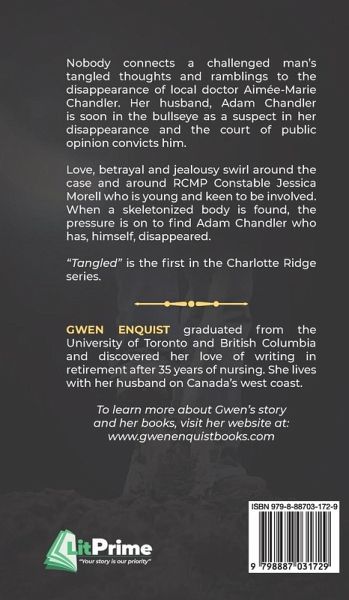 Nobody connects a challenged man's tangled thoughts and ramblings to the disappearance of local doctor Aimée-Marie Chandler. Her husband, Adam Chandler is soon in the bullseye as a suspect in her disappearance and the court of public opinion convicts him. Love, betrayal and jealousy swirl around the case and around RCMP Constable Jessica Morell who is young and keen to be involved. When a skeletonized body is found, the pressure is on to find Adam Chandler who has, himself, disappeared. "Tangled" is the fi rst in the Charlotte Ridge series.