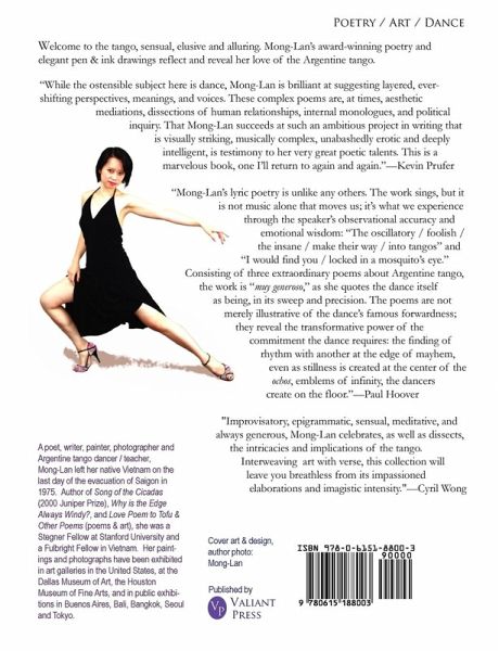 Welcome to the tango, sensual, elusive and alluring. In "Tango, Tangoing: Poems & Art," Mong-Lan extends an invitation to explore with her the sensual world of Argentine tango through poetry and art. Her striking poetry and elegant pen & ink drawings of tango dancers illuminate and reveal this remarkable world in an original manner that captivates and intrigues, leaving you "breathless from its impassioned elaborations and imagistic intensity." Prize-winning poet, visual artist and Argentine tango dancer / teacher, Mong-Lan combines her talents and knowledge in one beautiful, luminous book. Mong-Lan's honors include the Juniper Prize, a Fulbright Fellowship in Vietnam, a Stegner Fellowship at Stanford University, inclusion in Best American Poetry and Pushcart Prize Anthology volumes. Her artwork has been exhibited in galleries in the United States, the Dallas Museum of Art, the Museum of Fine Arts in Houston, the U.S. Capitol House, and in public exhibitions in Tokyo, Seoul, Bali and Bangkok.