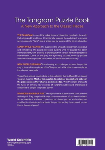 THE TANGRAM is one of the oldest types of dissection puzzles in the world that originated from China. It traditionally requires the participant to arrange seven pieces (or "tans") into a shape just by looking at the given silhouette. LEARN WHILE PLAYING The puzzles in this unique book are fresh, innovative and compelling. The puzzle pieces are building units for puzzles that boost mental dexterity with a variety of challenges from various fields of recreational mathematics. Come on and play with symmetry puzzles, cover-up puzzles and self-similarity puzzles to increase your skill and mental acuity! NEW PUZZLE DESIGNS To add variety and challenge, some of the puzzles may not use all seven pieces of the Tangram set, while others may use pieces from two or more sets. The authors utilize a creative twist in this collection that is different from classic Tangram puzzles: Most of the puzzles do not allow connections between the pieces unless they share a common edge. With this slight change to the rules, an entirely new universe of Tangram puzzles and challenges is unleashed to delight the puzzle solver! PROVIDES HOURS OF FUN The majority of the puzzles in this book are new and original. They range in difficulty to suit various levels of puzzle enthusiasts. Some selections are based upon famous classic puzzles while others are modified to stimulate and captivate the puzzlist as they have done for more than a thousand years!