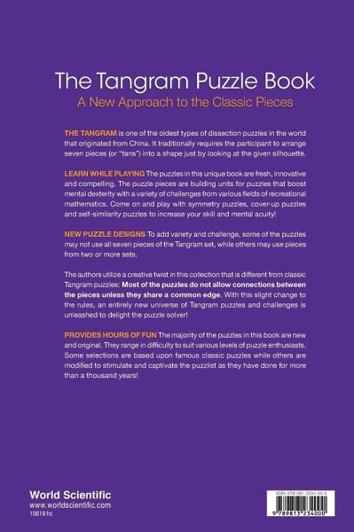 THE TANGRAM is one of the oldest types of dissection puzzles in the world that originated from China. It traditionally requires the participant to arrange seven pieces (or "tans") into a shape just by looking at the given silhouette. LEARN WHILE PLAYING The puzzles in this unique book are fresh, innovative and compelling. The puzzle pieces are building units for puzzles that boost mental dexterity with a variety of challenges from various fields of recreational mathematics. Come on and play with symmetry puzzles, cover-up puzzles and self-similarity puzzles to increase your skill and mental acuity! NEW PUZZLE DESIGNS To add variety and challenge, some of the puzzles may not use all seven pieces of the Tangram set, while others may use pieces from two or more sets. The authors utilize a creative twist in this collection that is different from classic Tangram puzzles: Most of the puzzles do not allow connections between the pieces unless they share a common edge. With this slight change to the rules, an entirely new universe of Tangram puzzles and challenges is unleashed to delight the puzzle solver! PROVIDES HOURS OF FUN The majority of the puzzles in this book are new and original. They range in difficulty to suit various levels of puzzle enthusiasts. Some selections are based upon famous classic puzzles while others are modified to stimulate and captivate the puzzlist as they have done for more than a thousand years!