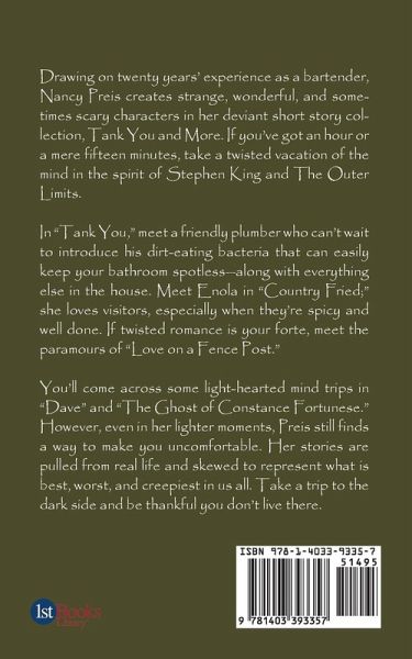 Drawing on twenty years¿ experience as a bartender, Nancy Preis creates strange, wonderful, and sometimes scary characters in her deviant short story collection, Tank You and More. If yoüve got an hour or a mere fifteen minutes, take a twisted vacation of the mind in the spirit of Stephen King and The Outer Limits. In ¿Tank You,¿ meet a friendly plumber who can¿t wait to introduce his dirt-eating bacteria that can easily keep your bathroom spotless¿along with everything else in the house. Meet Enola in ¿Country Fried;¿ she loves visitors, especially when they¿re spicy and well done. If twisted romance is your forte, meet the paramours of ¿Love on a Fence Post.¿ Yoüll come across some light-hearted mind trips in ¿Dave¿ and ¿The Ghost of Constance Fortunese.¿ However, even in her lighter moments, Preis still finds a way to make you uncomfortable. Her stories are pulled from real life and skewed to represent what is best, worst, and creepiest in us all. Take a trip to the dark side and be thankful you don¿t live there.