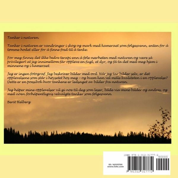 Tanker i naturen er en poesibok ledsaget av bilder, hvor samarbeidet mellom bokstaver og bilder er et vart og nydelig resultat. Boka er en perfekt gave for den som har alt, for den som ikke har Tanker I Naturen og til deg selv fordi du fortjener den! Oppfølgeren Tanker I Naturen 2 finner du også her inne, og nr. 3 er under arbeid. Responsen for nr. 1 har vært enorm blant mine faste lesere. Flere av diktene og bildene har blitt lagt ut på bloggen min, med begeistret resultat.