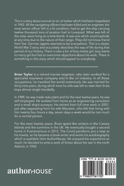 This is a story about survival on an oil tanker which had been torpedoed in 1942. All the navigating officers had been killed and an engineer, the most senior officer left in a fit condition, had to get the ship carrying twelve thousand tons of aviation fuel to Liverpool. What was left of the crew, were living on a time bomb. It was one which could explode at any time due to the nature of their cargo. They did not know friend from foe. German agents seemed to be everywhere. This is a classic World War 2 story and accurately describes the way of life during that period of our history. There is also a bit of boy meets girl, boy wants to marry girl but has to overcome objections about his work. There is something in this story which should appeal to everybody.