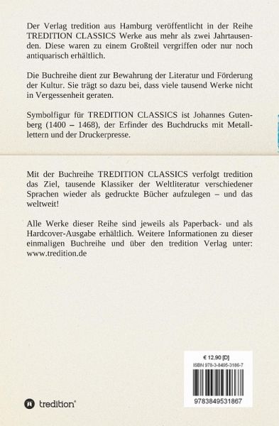 Dieses Werk ist Teil der Buchreihe TREDITION CLASSICS. Der Verlag tredition aus Hamburg veröffentlicht in der Buchreihe TREDITION CLASSICS Werke aus mehr als zwei Jahrtausenden. Diese waren zu einem Großteil vergriffen oder nur noch antiquarisch erhältlich. Mit der Buchreihe TREDITION CLASSICS verfolgt tredition das Ziel, tausende Klassiker der Weltliteratur verschiedener Sprachen wieder als gedruckte Bücher zu verlegen und das weltweit! Die Buchreihe dient zur Bewahrung der Literatur und Förderung der Kultur. Sie trägt so dazu bei, dass viele tausend Werke nicht in Vergessenheit geraten.