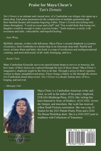 In Tan's Donuts, a donut shop owner reflects on the orders of his most memorable customers. Maya Cheav tells the bittersweet story of a Cambodian war refugee and survivor of the Khmer Rouge adjusting to life in America while having to sacrifice his dreams to survive. This poetry chapbook reflects on complex Southeast Asian family dynamics, intergenerational trauma, and breaking the cycle before it's too late.