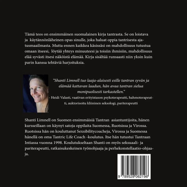 Tämä teos on ensimmäinen suomalainen kirja tantrasta. Se on loistava ja käytännönläheinen opas sinulle, joka haluat oppia tantrisesta aja-tusmaailmasta. Mutta ennen kaikkea käsissäsi on mahdollisuus tutustua omaan itseesi, löytää yhteys minuuteesi ja toisiin ihmisiin, mahdollisuus elää syvästi itsesi näköistä elämää. Kirja sisältää runsaasti niin yksin kuin parin kanssa tehtäviä harjoituksia.