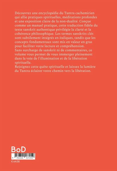 Découvrez une encyclopédie du Tantra cachemirien qui allie pratiques spirituelles, méditations profondes et une exposition claire de la non-dualité. Conçue comme un manuel pratique, cette traduction fidèle du texte sanskrit authentique privilégie la clarté et la cohérence philosophique. Les termes sanskrits clés sont subtilement intégrés en italiques, tandis que les concepts fondamentaux sont mis en valeur en gras pour faciliter votre lecture et compréhension. Sans surcharge de sanskrit ni de commentaires, ce volume vous permet de vous immerger pleinement dans la voie de l'illumination et de la libération spirituelle. Rejoignez cette quête spirituelle et laissez la lumière du Tantra éclairer votre chemin vers la libération.