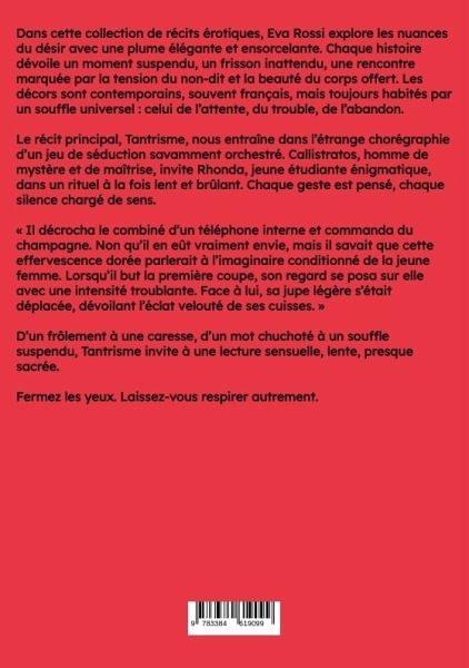 Dans cette collection de récits érotiques, Eva Rossi explore les nuances du désir avec une plume élégante et ensorcelante. Chaque histoire dévoile un moment suspendu, un frisson inattendu, une rencontre marquée par la tension du non-dit et la beauté du corps offert. Les décors sont contemporains, souvent français, mais toujours habités par un souffle universel : celui de l'attente, du trouble, de l'abandon.Le récit principal, Tantrisme, nous entraîne dans l'étrange chorégraphie d'un jeu de séduction savamment orchestré. Callistratos, homme de mystère et de maîtrise, invite Rhonda, jeune étudiante énigmatique, dans un rituel à la fois lent et brûlant. Chaque geste est pensé, chaque silence chargé de sens.« Il décrocha le combiné d'un téléphone interne et commanda du champagne. Non qu'il en eût vraiment envie, mais il savait que cette effervescence dorée parlerait à l'imaginaire conditionné de la jeune femme. Lorsqu'il but la première coupe, son regard se posa sur elle avec une intensité troublante. Face à lui, sa jupe légère s'était déplacée, dévoilant l'éclat velouté de ses cuisses. »D'un frôlement à une caresse, d'un mot chuchoté à un souffle suspendu, Tantrisme invite à une lecture sensuelle, lente, presque sacrée.Fermez les yeux. Laissez-vous respirer autrement.