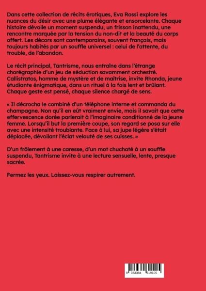 Dans cette collection de récits érotiques, Eva Rossi explore les nuances du désir avec une plume élégante et ensorcelante. Chaque histoire dévoile un moment suspendu, un frisson inattendu, une rencontre marquée par la tension du non-dit et la beauté du corps offert. Les décors sont contemporains, souvent français, mais toujours habités par un souffle universel : celui de l'attente, du trouble, de l'abandon.Le récit principal, Tantrisme, nous entraîne dans l'étrange chorégraphie d'un jeu de séduction savamment orchestré. Callistratos, homme de mystère et de maîtrise, invite Rhonda, jeune étudiante énigmatique, dans un rituel à la fois lent et brûlant. Chaque geste est pensé, chaque silence chargé de sens.« Il décrocha le combiné d'un téléphone interne et commanda du champagne. Non qu'il en eût vraiment envie, mais il savait que cette effervescence dorée parlerait à l'imaginaire conditionné de la jeune femme. Lorsqu'il but la première coupe, son regard se posa sur elle avec une intensité troublante. Face à lui, sa jupe légère s'était déplacée, dévoilant l'éclat velouté de ses cuisses. »D'un frôlement à une caresse, d'un mot chuchoté à un souffle suspendu, Tantrisme invite à une lecture sensuelle, lente, presque sacrée.Fermez les yeux. Laissez-vous respirer autrement.