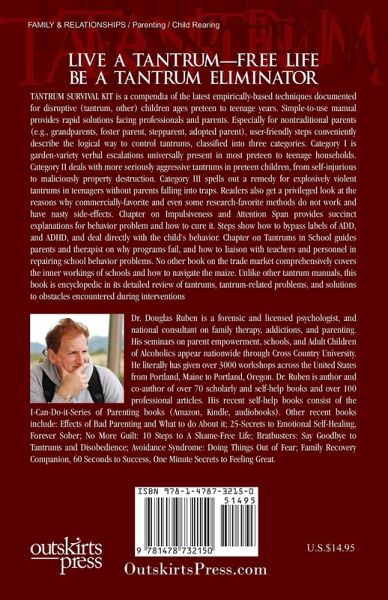 TANTRUM SURVIVAL KIT is a compendia of the latest empirically-based techniques documented for disruptive (tantrum, other) children ages preteen to teenage years. Simple-to-use manual provides rapid solutions facing professionals and parents. Especially for nontraditional parents (e.g., grandparents, foster parent, stepparent, adopted parent), user-friendly steps conveniently describe the logical way to control tantrums, classified into three categories. Category I is garden-variety verbal escalations universally present in most preteen to teenage households. Category II deals with more seriously aggressive tantrums in preteen children, from self-injurious to maliciously property destruction. Category III spells out a remedy for explosively violent tantrums in teenagers without parents falling into traps. Readers also get a privileged look at the reasons why commercially-favorite and even some research-favorite methods do not work and have nasty side-effects. Chapter on Impulsiveness and Attention Span provides succinct explanations for behavior problem and how to cure it. Steps show how to bypass labels of ADD, and ADHD, and deal directly with the child's behavior. Chapter on Tantrums in School guides parents and therapist on why programs fail, and how to liaison with teachers and personnel in repairing school behavior problems. No other book on the trade market comprehensively covers the inner workings of schools and how to navigate the maize. Unlike other tantrum manuals, this book is encyclopedic in its detailed review of tantrums, tantrum-related problems, and solutions to obstacles encountered during interventions
