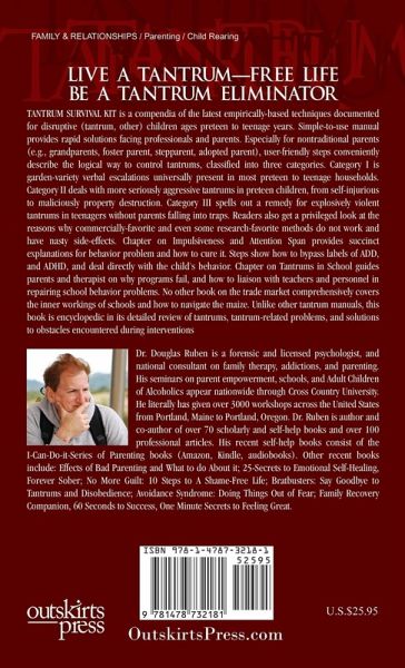 TANTRUM SURVIVAL KIT is a compendia of the latest empirically-based techniques documented for disruptive (tantrum, other) children ages preteen to teenage years. Simple-to-use manual provides rapid solutions facing professionals and parents. Especially for nontraditional parents (e.g., grandparents, foster parent, stepparent, adopted parent), user-friendly steps conveniently describe the logical way to control tantrums, classified into three categories. Category I is garden-variety verbal escalations universally present in most preteen to teenage households. Category II deals with more seriously aggressive tantrums in preteen children, from self-injurious to maliciously property destruction. Category III spells out a remedy for explosively violent tantrums in teenagers without parents falling into traps. Readers also get a privileged look at the reasons why commercially-favorite and even some research-favorite methods do not work and have nasty side-effects. Chapter on Impulsiveness and Attention Span provides succinct explanations for behavior problem and how to cure it. Steps show how to bypass labels of ADD, and ADHD, and deal directly with the child's behavior. Chapter on Tantrums in School guides parents and therapist on why programs fail, and how to liaison with teachers and personnel in repairing school behavior problems. No other book on the trade market comprehensively covers the inner workings of schools and how to navigate the maize. Unlike other tantrum manuals, this book is encyclopedic in its detailed review of tantrums, tantrum-related problems, and solutions to obstacles encountered during interventions
