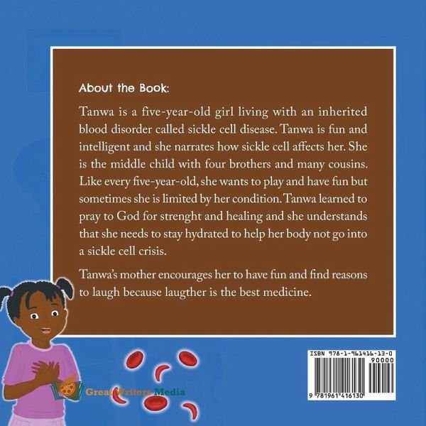 About the Book: Tanwa is a five-year-old girl living with an inherited blood disorder called sickle cell disease. Tanwa is fun and intelligent and she narrates how sickle cell affects her. She is the middle child with four brothers and many cousins. Like every five-year-old, she wants to play and have fun but sometimes she is limited by her condition. Tanwa learned to pray to God for strength and healing and she understands that she needs to stay hydrated to help her body not go into a sickle cell crisis. Tanwa's mother encourages her to have fun and find reasons to laugh because laughter is the best medicine.