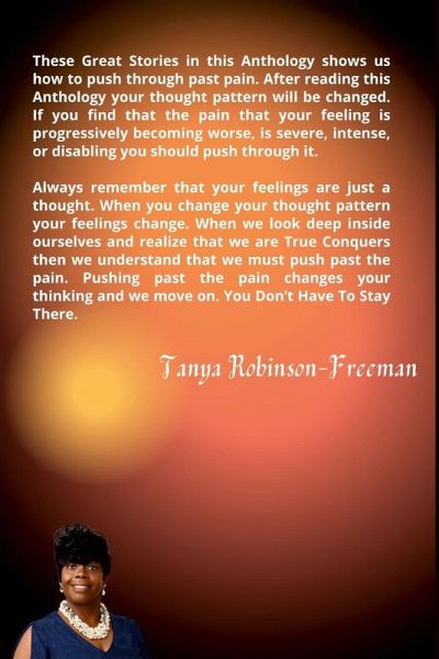 These Great Stories in this Anthology show us how to push through past pain. After reading this Anthology your thought pattern will be changed. If you find that the pain that you feeling is progressively becoming worse, is severe, intense, or disabling you should push through it. Always remember that your feelings are just a thought. When you change your thought pattern your feelings change. When we look deep inside ourselves and realize that we are True Conquers then we understand that we must push past the pain. Pushing past the pain changes your thinking and we move on. You Don't Have To Stay There.