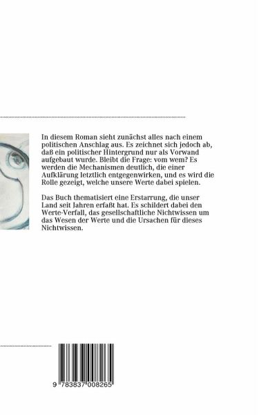 In diesem Roman sieht zunächst alles nach einem politischen Anschlag aus. Es zeichnet sich jedoch ab, daß ein politischer Hintergrund nur als Vorwand aufgebaut wurde. Bleibt die Frage: von wem? Es werden die Mechanismen deutlich, die einer Aufklärung letztlich entgegenwirken, und es wird die Rolle gezeigt, welche unsere Werte dabei spielen.Das Buch thematisiert eine Erstarrung, die unser Land seit Jahren erfaßt hat. Es schildert dabei den Werte-Verfall, das gesellschaftliche Nichtwissen um das Wesen der Werte und die Ursachen für dieses Nichtwissen.