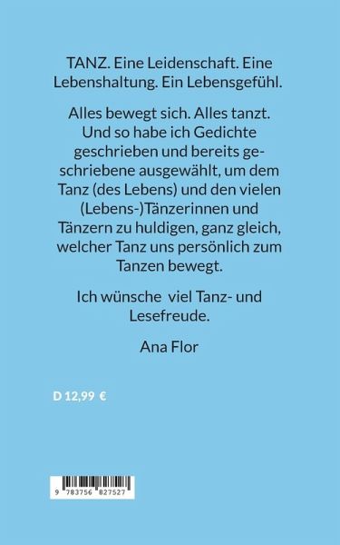 Tanz. Eine Leidenschaft. Eine Lebenshaltung. Ein Lebensgefühl. Von Kind an habe ich mein Leben getanzt - bei Regen sprang und hüpfte ich z. B. oft mit meinen roten Gummistiefeln in den Pfützen herum und vollführte einen Regentanz. Und auch die stillen, traurigen Stunden beweg(t)en mich, wenn auch manchmal nur innerlich. Immer war und ist es ein kleiner Tanz mit dem mehr oder weniger bewegten Leben.Und so habe ich Gedichte geschrieben und bereits geschriebene ausgewählt, um dem Tanz (des Lebens) und den vielen (Lebens-)Tänzerinnen und Tänzern zu huldigen, ganz gleich, welcher Tanz uns zum Tanzen bewegt.Viele Gedichte haben einen direkten Bezug zu Erlebtem, sind aus dem erlebten Zauber heraus bewegte Gedichtschritte, die mich begleiten und leicht sein lassen (in schweren Zeiten), so wie das Gedicht Tanz am See, dessen Worte sich durch einen magischen Moment formten, als ich in den Zeiten von Corona beschwingt meine Füße durchs weiche Gras tanzen ließ, wo Indoor-Sport out war und wir also outdoor tanzten. Und was aus der Not heraus geboren wurde, erwies sich als unglaubliche Bereicherung.Die Gedichte zeigen auch, wie wichtig der Atem, die Pause und damit die Stille, vor allem im Soul Motion, sind (eine Richtung des Conscious Dance).Alles bewegt sich, alles tanzt.