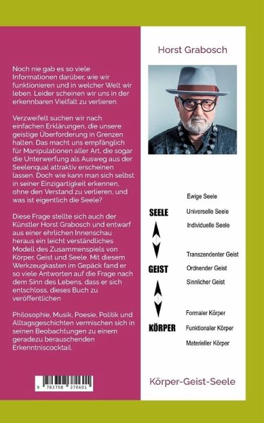 Noch nie gab es so viele Informationen darüber, wie wir funktionieren und in welcher Welt wir leben. Leider scheinen wir uns in der erkennbaren Vielfalt zu verlieren. Verzweifelt suchen wir nach einfachen Erklärungen, die unsere geistige Überforderung in Grenzen halten. Das macht uns empfänglich für Manipulationen aller Art, die sogar die Unterwerfung als Ausweg aus der Seelenqual attraktiv erscheinen lassen. Doch wie kann man sich selbst in seiner Einzigartigkeit erkennen, ohne den Verstand zu verlieren, und was ist eigentlich die Seele? Diese Frage stellte sich auch der Künstler Horst Grabosch und entwarf aus einer ehrlichen Innenschau heraus ein leicht verständliches Modell des Zusammenspiels von Körper, Geist und Seele. Mit diesem Werkzeugkasten im Gepäck fand er so viele Antworten auf die Frage nach dem Sinn des Lebens, dass er sich entschloss, dieses Buch zu veröffentlichen. Philosophie, Musik, Poesie, Politik und Alltagsgeschichten vermischen sich in seinen Beobachtungen zu einem geradezu berauschenden Erkenntniscocktail.