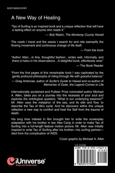 A New Way of Healing Tao of Surfing is an inspired book and a unique reflection that will have a lasting effect on anyone who reads it." -Bob Walch, The Monterey County Herald The roads I travel and the waves I search for and ride exemplify the flowing movement and continuous change of life itself. - From the book "Author Allen in fine, thoughtful fashion writes well, informally, and there is haiku in his observations A delightful book, effortlessly wise." -The Book Reader "From the first pages of this remarkable book I was captivated by the gently profound philosophy of riding through life with graceful balance." -Greg Ambrose, author of Surfer's Guide to Hawaii and co-author of Memories of Duke, the Legend Comes to Life Internationally acclaimed and Pulitzer Prize nominated author Michael A. Allen, takes you on a journey into the recesses of your soul and explores the ontological question, "What is our underlying essence?" Mr. Allen uses the metaphor of the sea, and its ebb and flow, to describe the Tao of life's cycle. And he discovers within this unique reflection a new way to comfort and heal the Self from the trauma of death. His long time interest in film brought him to write the screenplay adaptation with his brother in law Alex Carig in order to make Tao of Surfing into a full-length feature motion picture. Mr. Allen was initially inspired to write Tao of Surfing after his brother-his surfing partner-died from the complication