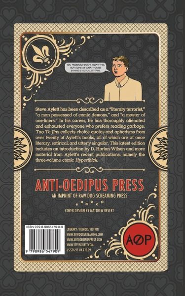 Steve Aylett has been described as a "literary terrorist," "a man possessed of comic demons," and "a master of one-liners." In his career, he has has thoroughly alienated and exhausted everyone who prefers reading garbage. Tao Te Jinx collects choice quotes and aphorisms from over twenty of Aylett's books, all of which are at once literary, satirical, and utterly singular. This latest edition includes an introduction by D. Harlan Wilson and more material from Aylett's latest publications, namely the three-volume comic Hyperthick.