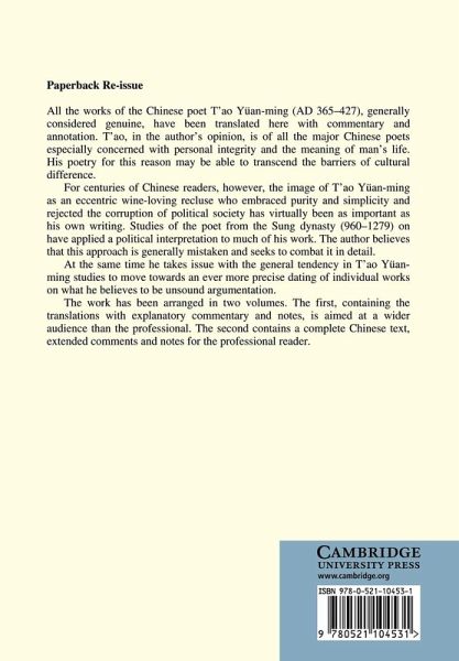 All the works of the Chinese poet T'ao Yuan-ming considered genuine have been translated here with commentary and annotation.