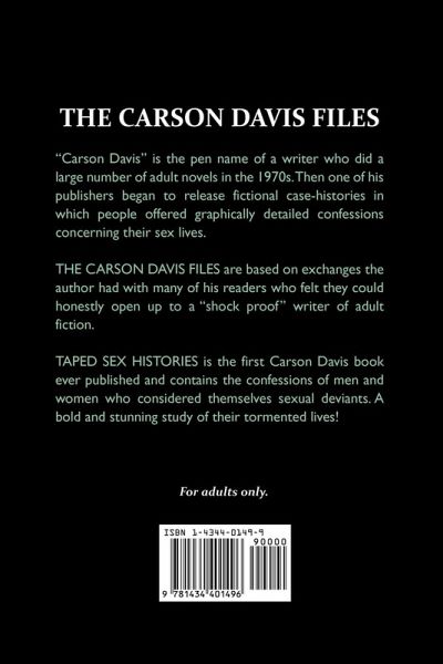 """Carson Davis"" is the pen name of a writer who did a large number of adult novels in the 1970s. Then one of his publishers began to release fictional case-histories in which people offered graphically detailed confessions concerning their sex lives. THE CARSON DAVIS FILES are based on exchanges the author had with many of his readers who felt they could novestly open up to a ""shock proof"" writer of adult fiction. TAPED SEX HISTORIES is the first Carson David book ever published and contains the confessions of men and women who considered themselves sexual deviants. A bold and stunning study of their tormented lives!"