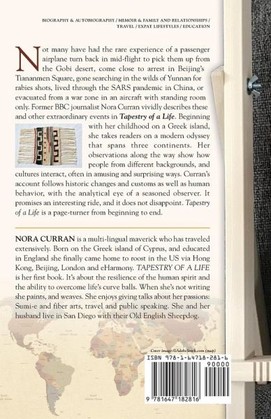 Not many have had the rare experience of a passenger airplane turn back in mid-flight to pick them up from the Gobi desert, come close to arrest in Beijing's Tiananmen Square, gone searching in the wilds of Yunnan for rabies shots, lived through the SARS pandemic in China, or been evacuated from a war zone in an aircraft with standing room only. Former BBC journalist Nora Curran vividly describes these and other extraordinary events in TAPESTRY OF A LIFE. Beginning with her childhood on a Greek island, she takes readers on a modern odyssey that spans three continents. Her observations along the way show how people from different backgrounds, and cultures interact, often in amusing and surprising ways. Curran's account follows historic changes and customs, as well as human behavior, with the analytical eye of a seasoned observer. It promises an interesting ride and it does not disappoint. TAPESTRY OF A LIFE is a page-turner from beginning to end.