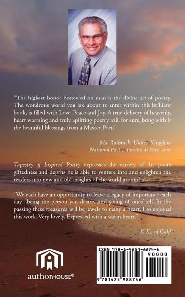 (Example of a Cinquain Poem) Perfume her special scent stimulating effect keeps her forever close to me fragrant Poetry is alive with inspiration, romance, humor, joy, and sensuality. James Pocza, in Tapestry of Inspired Poetry, has chosen these words as carefully as an artist chooses the colors he paints on a canvas. Many colorful words and images draw the reader into a world of diverse poetry, fun, spirited enjoyment, and heartwarming pleasure. This is a unique book of word roses that will continue to bloom and never wilt or die. After reading these poems you may be inspired to write, even if it is only one poem, (Yes, you can). Share that poem with a loved one or write many poems leaving a legacy to your family and friends.
