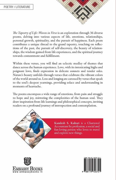 The Tapestry of Life: Woven in Verse is an exploration through 36 diverse poems, delving into various aspects of life, emotions, relationships, personal growth, spirituality, and the pursuit of happiness. Each poem contributes a unique thread to the grand tapestry, touching on reflections of the past, the pursuit of self-discovery, the beauty of relationships, the wisdom gained from life experiences, and the spiritual journey towards contentment and fulfillment.Within these verses, you will find an eclectic medley of themes that dance across the human experience. Love, with its intoxicating highs and poignant lows, finds expression in delicate sonnets and tender odes. Nature's beauty unfolds through verses that celebrate the vibrant colors of the world around us. Loss and longing are caressed by verses that speak to the soul's deepest yearnings, providing solace and understanding in moments of heartache.The poems encompass a wide range of emotions, from pain and struggle to hope and joy, mirroring the complexities of the human soul. They draw inspiration from life learnings and philosophical concepts, inviting readers on a profound journey of introspection and contemplation.About the Author:Kamlesh S. Kaltari is a Chartered Accountant by profession, a social and fun-loving person who loves to travel and explore new things.