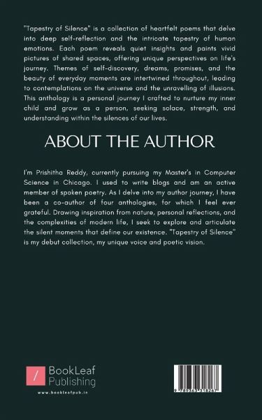 "Tapestry of Silence" is a collection of heartfelt poems that delve into deep self-reflection and the intricate tapestry of human emotions. Each poem reveals quiet insights and paints vivid pictures of shared spaces, offering unique perspectives on life's journey. Themes of self-discovery, dreams, promises, and the beauty of everyday moments are intertwined throughout, leading to contemplations on the universe and the unravelling of illusions. This anthology is a personal journey I crafted to nurture my inner child and grow as a person, seeking solace, strength, and understanding within the silences of our lives.