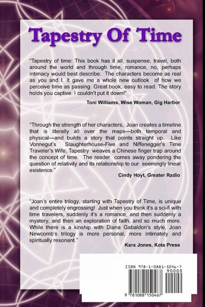 Tapestry of Time: This book has it all, mystery, romance, spirituality, travel (around the world and through time), intimacy and erotica. It gives a whole new outlook of how we perceive time as passing and introduces an interesting perspective of how we each vibrationally effect our surroundings. The story holds you captive. Through the strength of her characters, Joan creates a timeline that is literally all over the maps-both temporal and physical-and builds a story that points straight up. Like Vonnegut's Slaughterhouse-Five and Niffenegger's Time Traveler's Wife, Tapestry weaves a Chinese finger trap around the concept of time. The reader comes away pondering the question of relativity and its relationship to our seemingly linear existence.