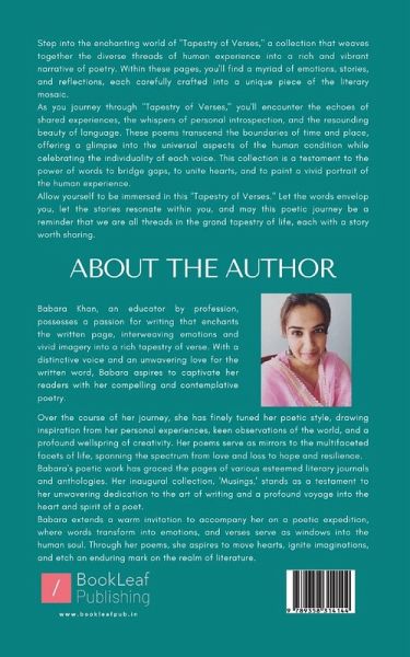 Babara Khan, an educator by profession, possesses a passion for writing that enchants the written page, interweaving emotions and vivid imagery into a rich tapestry of verse. With a distinctive voice and an unwavering love for the written word, Babara aspires to captivate her readers with her compelling and contemplative poetry. Over the course of her journey, she has finely tuned her poetic style, drawing inspiration from her personal experiences, keen observations of the world, and a profound wellspring of creativity. Her poems serve as mirrors to the multifaceted facets of life, spanning the spectrum from love and loss to hope and resilience. Babara's poetic work has graced the pages of various esteemed literary journals and anthologies. Her inaugural collection, 'Musings,' stands as a testament to her unwavering dedication to the art of writing and a profound voyage into the heart and spirit of a poet. Babara extends a warm invitation to accompany her on a poetic expedition, where words transform into emotions, and verses serve as windows into the human soul. Through her poems, she aspires to move hearts, ignite imaginations, and etch an enduring mark on the realm of literature.