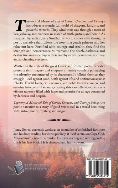 Tapestry: A Medieval Tale of Curses, Crowns, and Courage introduces a wonderful world of dragons, knights, and powerful wizards. They wind their way through a maze of lies, jealousy, and madness in search of truth, justice, and honor. As imagined by author Jerry Smith, this world comes alive through a poetic narrative that follows the story of a gentle princess and her reluctant hero. Fortified with courage and stealth, they find the strength and perseverance to overcome the death, darkness, and destruction unleashed upon their land by an evil, power-hungry mage and a scheming sorceress. Written in the style of the great Greek and Roman poets, Tapestry presents rich imagery and eloquent rhyming couplets portraying the adversity encountered by its characters. It follows them as they struggle-evil against good, death against life, and destruction against rebirth. Feudal lords, evil enemies, and noble knights emerge and entwine into colorful strands, creating this carefully woven tale as a vibrant tapestry filled with hope and promise for an age consumed by darkness and despair. Tapestry: A Medieval Tale of Curses, Crowns, and Courage brings the poetic narrative to a story of good versus evil in a world brimming with justice, honor, mystery, and magic.