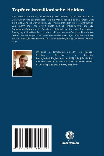 Ziel dieser Arbeit ist es, die Beziehung zwischen Geschichte und Literatur zu untersuchen und zu ergründen, wie die Überwindung dieser Grenzen Licht auf beide Bereiche werfen kann. Das Thema dreht sich um die Konstruktion von Bildern (aus der ersten Hälfte des 20. Jahrhunderts) über die Bandeirante-Bewegung in Brasilien. Jahrhunderts über die Bandeirante-Bewegung in Brasilien. Es soll untersucht werden, wie Cassiano Ricardo, ein Dichter der damaligen Zeit, über die Bandeirante-Saga reflektiert und wie sie als ideologisches Element für die Vargas-Regierung betrachtet werden kann.