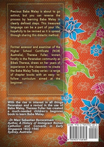 Precious Baba Malay is about to go extinct, but you can reverse the process by learning Baba Malay in clearly defined steps. This treasured language can be a part of your life, hopefully to be revived as it is spread through sharing this didactic method. Former assessor and examiner of the Higher School Certificate (NSW, Australia), Theresa Fuller, known fondly in the Peranakan community as Bibek Theresa, draws on her years of experience in the classroom to create the Baba Malay Today series - a range of chapter books with an easy-to-follow curriculum aimed at the beginner. Books 1 & 2 - Interrogatory Book 3 - Conjunctions Book 4 - Prepositions Book 5 - Antonyms Book 6 - Essence
