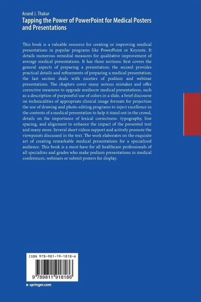 This book talks about developing and improvising upon medical presentations by equipping readers with critical technical tips and tricks to use popular presentation programs like PowerPoint or Keynote effectively. The book details numerous remedial measures for qualitative improvement of average medical presentations. It has three sections: first covers the general aspects of preparing a presentation; the second provides practical details and refinements of preparing a medical presentation; the last section deals with niceties of podium and webinar presentations. The chapters cover many serious mistakes and remedial measures to improve average medical presentations, such as a description of purposeful use of colors in a slide, a brief discourse on technicalities of appropriate clinical image formats for projection ensues; the use of drawing and photo-editing programs to inject excellence in the contents of a medical presentation to help it stand out in the crowd, details on the importance of lexical correctness- typography, line spacing and alignment to enhance the impact of the presented text and many more. Several short videos support and actively promote the viewpoints discussed in the text. This book elaborates on the exquisite art of creating remarkable medical presentations for a specialized audience. This book is a must-have for all healthcare professionals of all specialties and grades who make podium presentations in a medical conference webinar or submit posters for display.