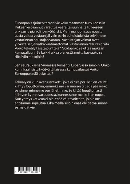Euroopanlaajuinen terrori vie koko maanosan turbulenssiin. Kukaan ei osannut varautua väärältä suunnalta tulleeseen uhkaan ja pian oli jo myöhäistä. Pieni mahdollisuus nousta uutta valtaa vastaan jäi vain parin puhdistuksista selvinneen vastarinnan edustajan varaan. Vastustajan voimat ovat ylivertaiset, eivätkä vaatimattomat vastarinnan resurssit riitä. Voiko tekoäly tasata puntteja? Voidaanko se ottaa mukaan kamppailuun. Se kaikki alkaa pienestä, mutta kasvaako se riittäviin mittoihin? Sen seurauksena Suomessa leimahti. Espanjassa samoin. Onko kuninkaallisista hyötyä tällaisessa kamppailussa? Voiko Eurooppa enää pelastua?